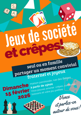 Le dimanche 15 février 2026 à partir de 15h : Jeux de société et crêpes à la Maison Paroissiale, rue des Belges – Venez partager un moment convivial , seul ou en famille !